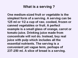 20 fl oz = 568 ml. A small salad or vegetable filled soup is also considered as being one portion--serving--of fruits and vegetables. You have to watch out for the fatty dressings and cheeses that often go with salads. Finally, 50 ml or 1/4 cup of dried fruit like a small box of raisins is a healthful snack. |