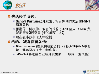 根据WHO,尽管对抗H5N1的疫苗在很多国家都在开发中,没有一种疫苗准备投入生产也没有一种疫苗预期能广泛应用,除非在世界性流行爆发之前的几个月。