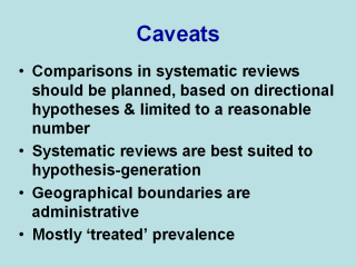 | There are a number of caveats though. Systematic reviews are secondary research ('research on research'). The object of scrutiny is not the incidence of schizophrenia per se, but the literature on this topic. So while this type of research cannot be used to 'prove' a hypothesis, the compiled data can encourage the generation of new hypotheses that can then be tested prospectively, with new data. National or health district catchment areas often provided convenient boundaries regarding access to services and minimal out-of-area leakage, but they may not be optimal for detecting variations of the disorder within or between various populations. Most of the studies provide rates that are the 'treated incidence' of schizophrenia (ie, the count of individuals who are identified by services and treated); this probably underestimates the true (underlying) incidence of schizophrenia. |