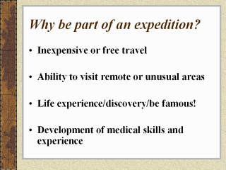| There are many reasons why medical personnel should consider supporting expeditions. The rewards of achievement can be met at all levels of expeditions. Some expeditions can be a claim to fame as well! |