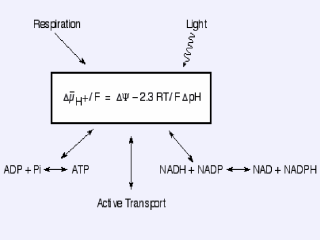 electrochemical gradient ( Since protons (i.e., hydrogen ions or H+) are being pumped vectorally by either the respiratory chain or the photosynthetic electron transfer chain, positive charge is being pumped, and an electrical potential (DY) is generated, the polarity of which depends upon which direction the protons are pumped (when protons are pumped out, DY is interior negative; when pumped in, DY is interior positive). In addition to DY, a chemical concentration gradient of protons (DpH) may also be established, the polarity of which is also dependent upon the vectorality of the proton pump (when protons are pumped out, DpH is interior alkaline; when pumped in, DpH is interior acid). Don’t worry about the constants (R, T and F) which are there simply to put both components into the same units [in this case, millivolts (mV)]. The important take-home message is that electrochemical proton gradient means just what it says; there are two components, DY and DpH, that are important energetically. |