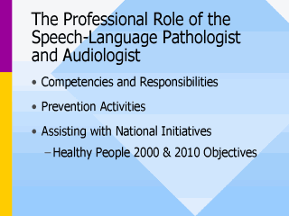 disorders of human communication.” Several Prevention Activities are: 1. A community awareness program for hearing conservation 2. School screenings disorders of speech, language, and voice 3. Family or caregiver education programs Competencies and Responsibilities for Speech-Language Pathologists and Audiologists, according to ASHA’s position statement Prevention of Communication Disorders (1988) outlines 10 competencies that clinicians must have if they are to play a significant role in developing and implementing prevention strategies. These competencies are: (a.) Use prevention terminology appropriately: (b.) Understand conditions that place individuals and populations at risk for various communication disorders: (c.) understand conditions which promote development and maintenance of optimal communication abilities (wellness); (d.), interpret the existing prevention literature in order to apply the information appropriately; (e.) present primary prevention information to groups known to be at risk for communication disorders and other appropriately; (f.) provide individual-, family- and community-focused primary prevention information and services; (g.) provide early identification and early intervention services for communication disorders occurring at any time during the life span; (h.) make appropriate referrals for prevention-related services not provided by speech-language pathologists or audiologists; and (I.) disseminate prevention information to various public sectors including health care professionals, social service professionals, and extended families Another role is in assisting with national initiatives, such as Healthy People 2010 Objectives. Several ways that SLP’s and A’s can participate are by integrating HP objectives into current programs, incorporating HP initiatives into community programs and joining the consortium. Transition Point: There are three levels of prevention: primary, secondary, and tertiary….. |