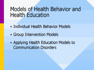 Health Behavior and Health Education A. Individual Health Behavior Model, the desire to avoid illness, disorder, or disability (or to get well), is based on the individual’s belief that a specific health action will prevent or ameliorate illness, disorder, or disability (e.g., not yelling to avoid development of a voice disorder). Three components of this model are: 1. Subjective perception of health threat 2. Subjective perception of net benefits of action 3. Cues to action, or the trigger that stimulate an individual to act. B. Group Intervention Models: Social Marketing refers to the design, implementation, and control of programs seeking to increase the acceptability of a social idea or health practice in a target group; promoting ideas, not products (e.g., advertising to targets a specific behavior to avoid). C. Health Education Models: When planning prevention and promotion programs, health education models can assist in the identification of attitudes, values, and beliefs that affect on an individual’s decision making or a population’s trends of behaviors (e.g., Why do physicians refer, or not refer, children for speech and language evaluations?)Transition Point: Understanding genetic predisposition for various communication disorders is also important in regard to prevention... |