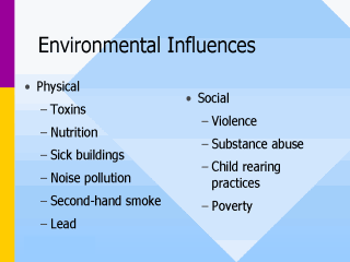 A. Physical influences include toxins, nutrition, sick buildings, noise pollution, second-hand smoke, and lead.