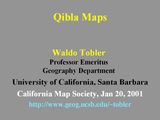 subject after reading a book by David A. King Qibla, in Arabic, asks for the geographic direction to the “cube”, or Ka’ba, in Mecca This is a fairly technical talk on a subject of recent interest. Map projections, are made somewhat obsolete by computer technology. For example, computing on the sphere or ellipsoid is now as easy as on a projection, and one computer atlas uses pictures of a globe that can be rotated to see any part. Nevertheless I am going to talk about a particular kind of map projection. Presented as a UCSB Geography Department colloquium November 2000, and at the California Map Society February 2001 . |