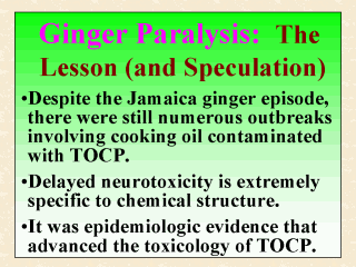 deliberately used for cooking (Ecobichon, 1982). Available toxicologic investigations and epidemiologic studies all have pointed to the fact that only the ortho isomer of tricresylphosphate is a strong inducer of delayed polyneuropathy in humans and some mammals. These observations suggest that, like some other adverse effects (such as those of thalidomide discussed in the last lecture), delayed neurotoxicity is extremely specific to chemical structure. Because TOCP is a strong inducer of delayed neuropathy, it is not a relatively potent inhibitor of the acetylcholinesterase enzyme. This fact was also confirmed by the numerous epidemiologic studies that were conducted to investigate the TOCP-related poisonings. Finally, this case study shows that, like in many other incidents, it was epidemiologic evidence that had facilitated as well as advanced the toxicology of TOCP. |