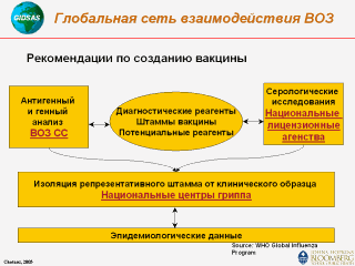 | Что требуется для создания вакцины? Глобальная сеть ВОЗ по гриппу ежегодно дает рекомендации для ее создания. Этот процесс - довольно сложен, т.к. требует наблюдений, выделения репрезентативного штамма, антигенного и генетического анализа, серологических исследований. |
