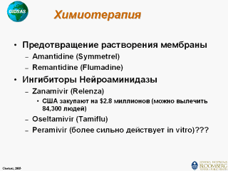 | M2 ингибиторы: Amantadine и rimantadine потенциально могут использоваться против пандемии гриппа, но к этим лекарствам может быстро развиться резистентность, что существенно снизит их эффективность. Некоторые из ныне циркулирующих штаммов H5N1 полностью резистентны к этим ингибиторам. Тем не менее, в случае появления после рекомбинации нового вируса, M2 ингибиторы могли бы его эффективно подавить. NA ингибиторы: Oseltamivir (коммерческое название Tamiflu) и Zanamivir (коммерческое название Relenza) способны снижать тяжесть и длительность сезонного гриппа. Эффективность NA ингибиторов кроме прочего зависит от их своевременного применения (в течение 48 часов после появления симптомов). Эти лекарства могли бы увеличить выживаемость заболевших гриппом H5N1, но на сегодняшний момент клинические испытания их ограничены. Ожидается, что вирус H5N1 будет чувствителен к действию NA ингибиторов. Антивирусная резистентность к NA ингибиторам клинически была выявлена незначительной, но во время широкого пандемического распространения вируса картина может измениться. Новый NA ингибитор Peramivir во время недавних испытаний показал свои потенциальные возможности. |