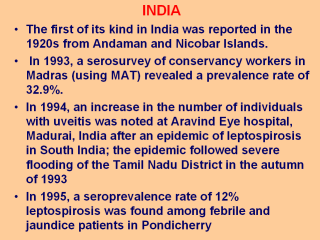 1997 in Mysore, Surat, North Andaman and Nagpur, causing 39 deaths. An outbreak of leptospirosis emerged in Orissa following supercyclone in 1999. |