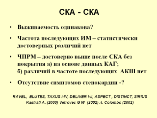 других исследований. Более поздняя генерация исследований оценивала исходы при использовании стентов с покрытием и стентов без покрытия. Несмотря на меньшую частоту повторных реваскуляризаций при использовании стентов с покрытием, до сих не выявлено доказательств преимуществ по выживаемости и частоте последующих ИМ при использовании какого либо определенного вида стента. Интересно то , что нет доказательств о преимуществе стентов с покрытием в облегчении симптомов стенокардии. Не потому, что преимуществ действительно нет, а потому, что эндоваскулярные вмешательства делали не дожидаясь клинических проявлений, на основании данных контрольной коронарографии. |