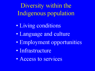 The Indigenous population is relatively small, geographically dispersed and heterogeneous. For example, housing conditions range from improvised shelters to typical suburban homes, and the communities in which people live range from extremely remote communities with no or few facilities, to large capital cities such as Sydney and Melbourne. It is likely that there are also heterogeneities within the Indigenous population with respect to health, but demonstrating this requires adequate data, which is what the rest of this lecture is about. |