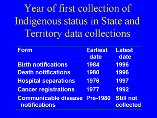 This table provides information about the date of first inclusion of a question about Indigenous status in various collections in the 6 States and 2 mainland Territories of Australia. For example, at least one jurisdiction collected information about Indigenous status on its communicable disease notification forms before 1980. In at least one jurisdiction, however, this information is not yet collected. All States and Territories now collect information about Indigenous status on birth and death notifications, cancer registrations and in hospital records. However, some collections in some jurisdictions do not yet use the standard question. |