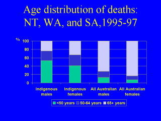 This slide shows the age distribution of deaths that occurred in the three year period 1995-97 in the Northern Territory (NT), Western Australia (WA) and South Australia (SA). According to the Australian Bureau of Statistics, these three jurisdictions were the only ones in which the identification of Indigenous deaths was adequate to allow for reporting during the relevant time period (other States have been added to the list for later years). It is important to note that these three jurisdictions together accounted for only about one-third of the Indigenous population of Australia, so they may not adequately represent the experience of the other jurisdictions. In NT, WA and SA combined, over half of all deaths identified as being of Indigenous males occurred in people less than 50 years old. This was true for only 13% of other male deaths. Among females, 41% of deaths identified as Indigenous, but only 7% of other deaths, occurred among people under 50 years old. Although the graph doesn’t show this, these differences were not due to high infant mortality, but to premature deaths among Indigenous adults. |