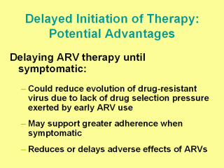 | Delaying therapy until later in the course of HIV infection, when clinical or immunologic symptoms appear, may result in reduced evolution of drug-resistant virus due to a lack of drug selection pressure, greater adherence to the therapeutic regimen when the patient is symptomatic rather than asymptomatic, and reduced or delayed adverse effects of antiretroviral therapy. |