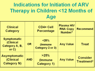 therapy is made. ¹ Plasma HIV RNA levels are higher in HIV-infected infants than older infected children and adults, and may be difficult to interpret in infants <12 months of age because overall HIV RNA levels are high and there is overlap in HIV RNA levels between infants who have and those who do not have rapid disease progression. ² Because HIV infection progresses more rapidly in infants than older children or adults, some experts would treat all HIV-infected infants <6 months or <12 months of age, regardless of clinical, immunologic or virologic parameters. |