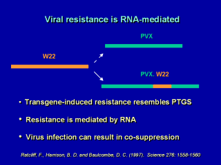 1. Baulcombe’s lab showed that cross-protection between viruses that normally don’t cross protect could be transferred by introducing a sequence from one into the other in such a way that it does not affect expression of the viral proteins. 2. This implies that the viral RNA itself can trigger a process in which closely related sequences are targetted for destruction (or, perhaps, aborted replication). 3. When a plant is infected with a virus into whose genome a copy of either an endogenous plant gene or a resident transgene has been inserted, the resident genes are silenced, much as is observed with co-suppression. All of these observations suggest a close relationship between the induction of viral immunity and PTGS. |
