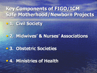 | Because FIGO has understood the importance of meeting women where they are in the community, all countries applying for funding through FIGO in the Safe Motherhood/Newborn Health projects are being required to involve players from these four groups. |