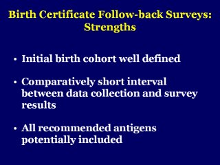 | Birth certificate follow-back surveys have the strengths of an initially well-defined cohort, a short time from data collection to survey results and include all antigens of interest. |