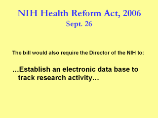 | The recent NIH Reform Act of 2006 specifically targeted the building of an electronic data base to track research, and to make the research of the NIH more available to US and world. A NIH Supercourse can play a very important role in sharing the invaluable NIH knowledge. |