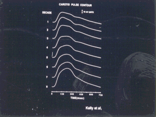 | Kelly and colleagues have documented the changes in shape of the carotid artery pulse wave between the first and eighth decade of life. The rise in systolic pressure and later fall in diastolic pressure is accompanied by a change in the shape of the systolic waveform, with a later peak at increasing age. |