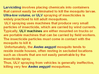 ineffective. Commercial aerosol sprays to kill the mosquitoes found indoors are useful, but "knockdown resistance" may occur in some locations. Individual householders may note that spray insecticide has only a temporary effect, knocking down or paralyzing mosquitoes that later recover and fly away. In such cases, the sprayed mosquitoes must also be squashed to prevent their recovery. |