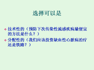 ·当有很多需求需要被满足时,我们必须比较每一项的成本和利益——这被称为分配效率评估。做这类决定很少仅仅考虑经济学背景,同时选择也很少是以“全或无”的方式来制定的。通常,我们需要根据目前服务可能的增长或减退来决定。任何资源利用的数量改变应从目前的水平来评估。因此,考虑成本和利益,或者增加的成本和不同选项的利益的变化是相关的。底线就是可利用的资源(输入)的增加,必须带来效应(输出)的相应变化。