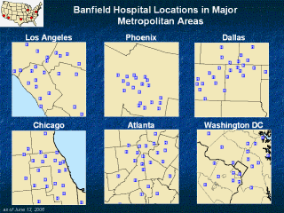 facilitating surveillance in areas at highest risk of bioterrorism · Banfield hospitals are present near most ports of entry and major military installations · There are 8 areas in the U.S. that have at least 15 Banfield hospitals located within a 50 mile radius |