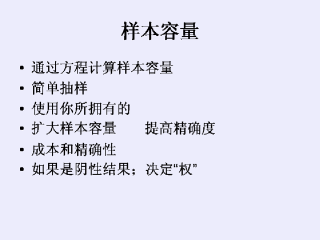 样本容量是流行病学的一个大问题。有多个确定样本容量的方程;然而用于计算的数据经常无法获得。有时候,用方程计算得到的样本容量也不可能得到!你必须经常计算你的研究所需要的样本容量。很多次,研究者要在总结研究后计算试验的权值来确定实验的结果是不是由于不恰当的抽样造成的。