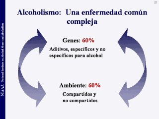 | Con más de tres décadas de investigación se ha firmemente establecido que los factores genéticos representan más de la mitad del riesgo para alcoholismo, y los factores ambientales, representan el resto. Este señalamiento, sin embargo, contradice la verdadera complejidad de los mecanismos subyacentes para el riesgo de, y protección contra, al abuso y dependencia al alcohol. Los factores genéticos y ambientales interactúan en formas muy complejas. |