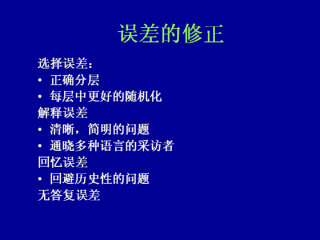 解释误差和无答复误差可在初步研究中被研究。那些问题未被回答?能否解释未答复的原因?未答复而剩下的问卷具有说明性,这种现象的一种逻辑回归可以指出,未答复是随机的(如,可忽视的),还是可预言的(如,不能忽略的)。在这种情况下,无答复将影响并误导研究结果。