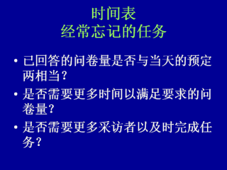 在调查中一个经常被遗忘的重要因素即是检查时间表。已完成的问卷量是否满足于预定量?目前开支是否与预算想富?