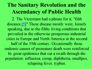 unwashed clothing on unwashed bodies. The sanitary revolution changed all that. It was a revolution in ways of thinking as much as an engineering triumph, a profound paradigm shift. For the first time the linkage was made between unsanitary living conditions and the diseases these conditions engendered [6]. That phrase "filth diseases" evokes the new sense of values that arose. The sanitary revolution involved much more than sewerage systems and clean water. Discovery of the tubercle bacillus and other dangerous respiratory pathogens led to understanding of the way infected sputum spread respiratory infection. People became fastidious about covering their nose and mouth when they coughed or sneezed -- instead of clearing their nostrils on the table cloth, and coughing and spitting on the living room floor. Doctors and nurses began to wash their hands after Oliver Wendell Holmes[7] and Ignaz Semmelweiss[8] demonstrated how childbed fever was spread by dirty hands from sick to healthy women; and the custom of personal hygiene spread to the rest of society. It was comparable to, and as important in altering the pattern of disease, as the sense of values and the behaviour change in much of the western world since the discovery by Doll, Hill[9], and others in the 1950s, that cigarette smoking causes lung cancer, and greatly increases the risk of coronary heart disease. |