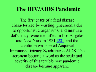Pasteur in Paris. Meantime in Africa south of the Sahara, HIV was rampaging through urbanizing communities in the new nations just as they were gearing up for a dramatic economic and professional recovery from the colonial era. The long incubation time between infection with HIV and the onset of frank AIDS -- it can be at least 20 years -- means that HIV-infected people have abundant time to spread the virus to their intimate friends and casual acquaintances, often without knowing they are infected. Among homosexual men in North America and Europe, and in Africa south of the Sahara, HIV was spread by the combination of promiscuous sexual encounters, abraded genital mucosal surfaces, and bizarre sexual preferences such as "fisting" (thrusting a clenched fist into the rectum) among gay men; and the use in some African cultures of astringent herbs to dry out the vagina and increase the friction of intercourse, thus allegedly enhancing sexual pleasure. More efficient ways to spread HIV by sexual contact could hardly be invented! An even more efficient way to spread HIV arose when it got into blood products like Factor 8, used to treat hemophilia. This is one of the great tragedies of our time, aggravated by moral bankruptcy on the part of public officials in some countries. |