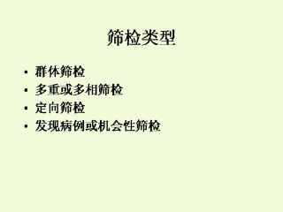 合应用多于一个筛检过程,就是多重筛检。筛检试验可用在有特异暴露的组别上,包括定向筛检,常用于环境卫生和职业卫生。最后一个类型是发现病例筛检,限制在出于其他目的向卫生工作者咨询的病人上。