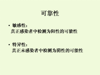 筛检项目的可靠性是用敏感性和特异性来衡量的。敏感性是筛检将真正感染者检测为阳性的能力。特异性是筛检将真正的未感染者检测为阴性的能力。计算这些测量值的方法在后面的幻灯片会给出。很明显,我们期望的筛检项目应当是具有很高的敏感性和特异性。一般很难达到,因为有些人明显感染了,有些明显没感染,而有些恰好落在他们之间。这种情况下,感染与未感染的分界点就是个有点武断的决定。任何筛检项目想要增加避免错过真实病例的能力就会升高未感染个体的数目,他们被筛检项目错误地识别成阳性。这样一来,我们是否需要敏感性或特异性的项目由条件和卫生负担来决定。一般我们说错误漏掉判断为阴性(假阴性)是非常重要的,在严重疾病中要尤其避免,而那些错误判断为阳性者(假阳性)则仅是一个警钟。