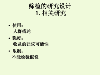 大量流行病学设计可用来评价筛检项目,包括相关研究、观察分析研究和随机试验。相关研究已经用来检验人群中与筛检频度有关的疾病趋势,或者比较不同人群中筛检频度与疾病发病率的关系。在揭示筛检与患病率或死亡率之间关系方面相关研究非常有用。但是由于来自这些研究的信息与人群而不是个体有关,不可能确认受益者与接受筛检者是同一批人。而且,这样的研究并不能够考虑到控制潜在的混杂危险因素。最后,筛检频率的衡量手段一般是人群的平均值,所以不能确定个体的最优筛检策略。