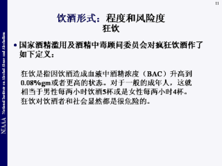 可导致醉酒的饮酒方式会对饮酒者造成危险。一个常用于描述这种方式的术语叫:狂饮。现在有很多对于这种饮酒方式的不同定义。为了澄清概念, 国家酒精滥用及酒精中毒顾问委员会(NAC)在2004年对疯狂饮酒作了一个标准化定义:Binge是指一种因饮酒造成血液中酒精浓度(BAC)升高到0.08%gm(各州法律上对饮酒驾驶的最高限)或者更高的一种状态。NAC进一步注释说对于一个一般的成年男性,这个BAC水平就相当于男性每两小时饮酒5杯或是女性每两小时4杯。