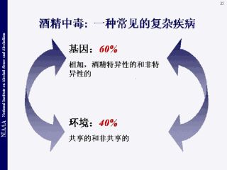 超过30年的研究明确表明,超过一半的饮酒风险度由遗传因素决定,剩余则是环境因素。然而,这一观点掩盖了酒精滥用及酒精依赖的风险及保护复杂的发生机制。基因和环境因素以一种极其复杂的方式相互作用。