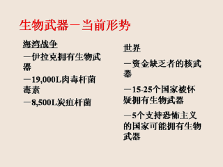 由于生物武器造价低廉,很难被发现并且可以导致大量人群死亡或致病,所以恐怖分子已经对此表现出强烈的兴趣。吸入40000个炭疽孢子(针尖体积大小)就可以导致95%的死亡可能性。生物武器可以由最小可能的启动装置引发,并且在一个相对封闭的环境里可以用一个铁罐很方便的使用,也可以在预先不告知或简单警告后放入食物系统中。这种武器被称作资金缺乏者的核武器,被那些资源比较缺乏的国家所钟爱。大约有15-25个国家被怀疑拥有生物武器。