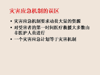 -误区1:灾害应急机制要求大量的资源动员。传统的医疗应急机制注重动员医疗资源(医生、护士、后勤人员和物资等)来救助各种外伤受害者、大量需要转移的人群以及伴随灾害而来的各种破坏性结果。这就会出现,在部分特定地区能够提供的资源不能满足突发的灾害事件的需求。事实上,在灾害应对中一个最大的问题是如何管理这些资源。什么时间处理?当灾难(人为或自然的)发生时,大量的医护人员通常在没有接到命令的情况下赶到现场进行救助。但糟糕的是,医护人员中的许多志愿者并没有接受过应对灾害的训练。一个明显的特征是这些人并不熟悉紧急情况的处理原则和流程,从没有使用过或见过治疗类选体系,并且不太愿意接受或执行灾害处理指挥系统的命令。导致在灾害事件中缺乏控制,而这些救援人员缺乏统一的指挥和调控。而在处理恐怖袭击事件时,如果这些救援人员缺乏NBC的训练,那么情况会更加糟糕。