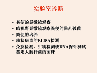 显微镜观察粪便,每个高倍镜视野20个或20个以上的白细胞和红细胞提示为侵袭性腹泻(可能是志贺氏细菌性腹泻)。显微镜观察粪便也可发现寄生虫和肠虫的感染。显微镜暗视野观察可快速诊断弧菌感染。粪便培养可用于检测细菌包括霍乱弧菌,沙门氏菌,志贺氏菌和其他的细菌。酶联免疫吸附试验用于轮状病毒的检测。抗体的检测用于大肠杆菌的不同血清型的鉴定。