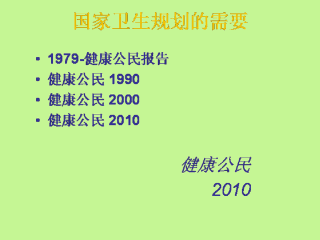 健康公民2000:民族健康改善与疾病预防的目标(1990年出台),确定到2000年要达到的目标。这正是国家卫生计划被第一次明确的阐明。