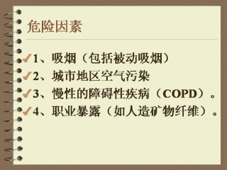 包括由吸烟造成的鳞片状细胞成层排列。肺部的瘢痕样组织可能会引发腺癌;肺囊肿和先天 性的肺纤维化将会增加腺癌和肺泡性细支气管细胞癌的发病率。