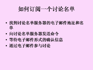 首先你必须知道你想加入的名单的地址和相应名单服务器的地址,你必须用电子邮件直接给名单服务器发出订阅命令