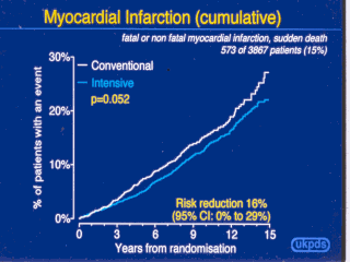 incidence of acute myocardial infarction in 2 groups. The intensive glycaemic control was