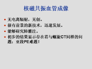 核磁共振血管成像(MRA)是一项相对较新的诊断PE的手段。最近,其在较大规模的疑诊PE患者队列中使用的可行性已经得到了证实。但是,亚段栓子很容易被漏掉,因而也存在着与螺旋CT相似的问题。主要的优点之一是:能够进行重复检查(例如治疗后的随访),因为它并不使用电离辐射。