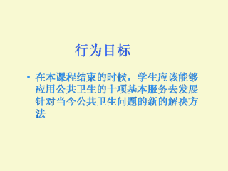 在本课程结束的时候,学生应该能够应用公共卫生的十项基本服务去发展针对当今公共卫生问题的新的解决方法