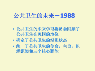 有一种关于公共卫生的说法是联合政府拥有资金,州政府拥有权力,当地政府拥有难题。因为公共卫生处于州政府的权力之下,在美国公共卫生有50种不同的执行方式。由药协会委员会(美国)所著的的公共卫生的未来,以学习公共卫生的未来为目的,(公共卫生的未来,国际科学学会1988。)回顾了公共卫生在美国的地位,并发现它正处于混乱状态。尽管距离公共卫生的未来的发表已经过了10年,它仍然是最全面,深刻的着眼于公共卫生并发起了一项系统的改变和改进公共卫生基础下部组织的工程。