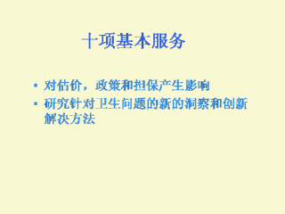 如果你已经数过了,你就会知道我只提到了九项基本服务。我认为,第十项基本服务影响了估价,政策和担保。那个基本服务是研究针对卫生问题的新的洞察和创新解决方法。公共卫生没有止境,必须持续不断的创新和发展。