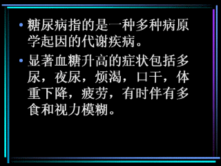 糖尿病指是一种以慢性高血糖伴随由于胰岛素的分泌或活动不足导致的糖类、脂肪和蛋白质代谢紊乱为特征的多种病原学起因的代谢疾病。
